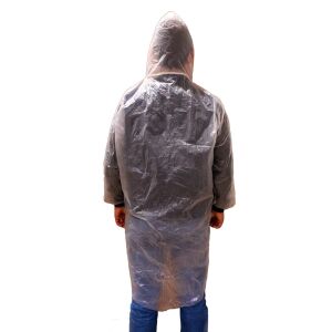 Kapüşonlu ve çıtçıtlı yapıda tek kullanımlık yağmurluk.